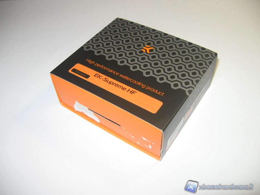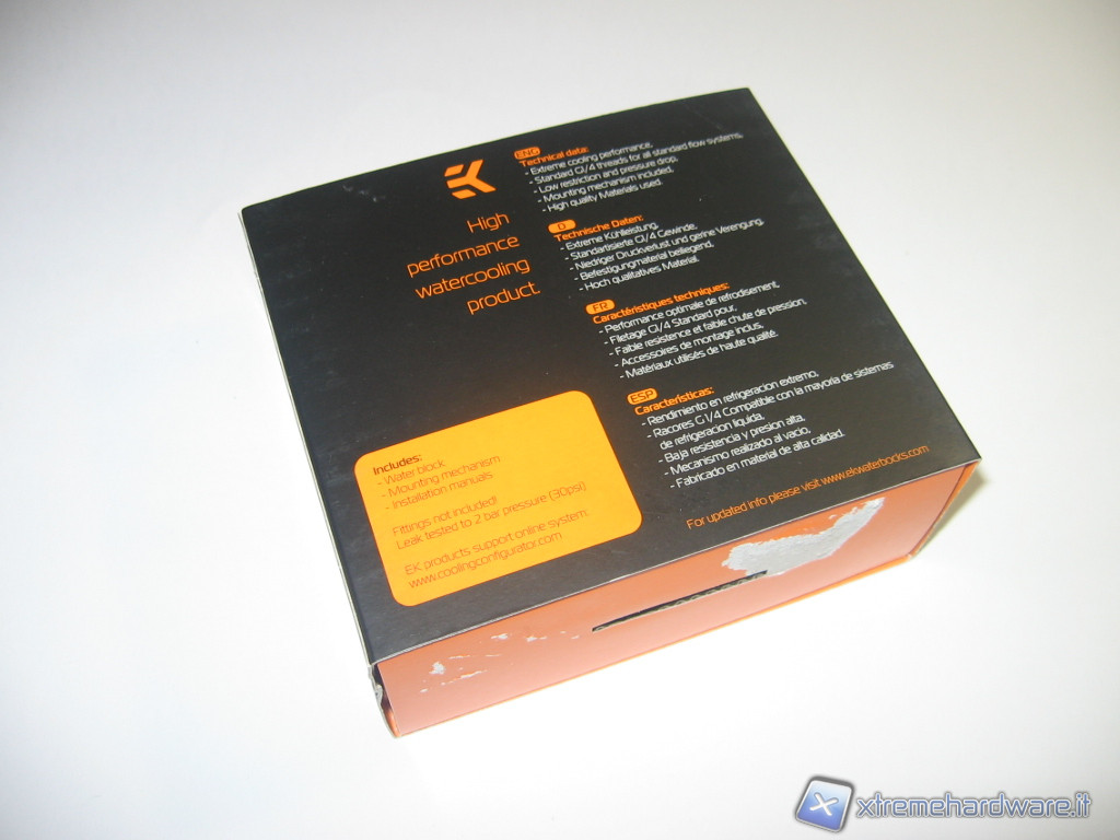 La scatola si presenta elegante nel suo aspetto esteriore e resistente. A conferma del controllo di qualità vi è il sigillo adesivo. Sulla scatola sono stampati sia il marchio dell’azienda sia il modello del waterblock che i dati tecnici sintetici.