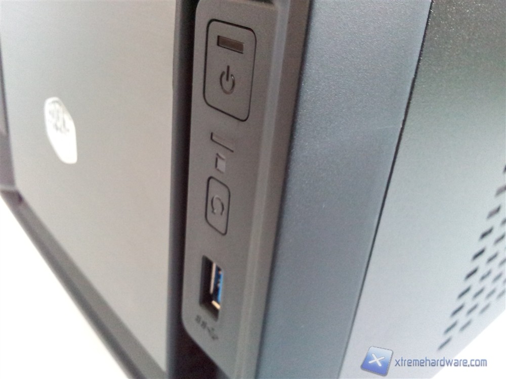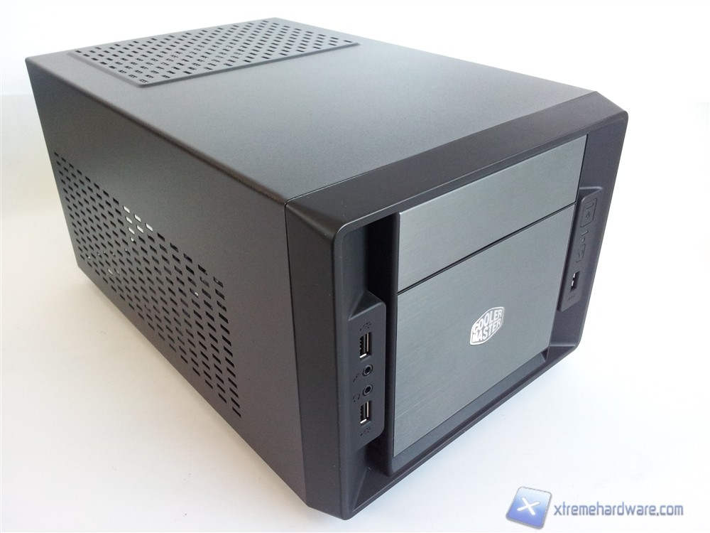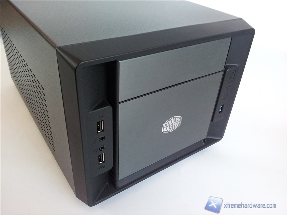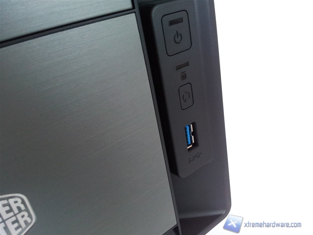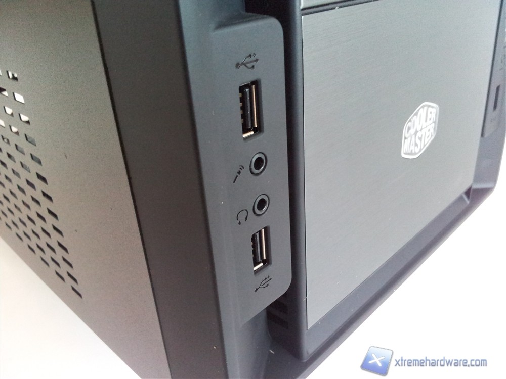 La parte frontale è, per ovvie ragioni, quella dal design più particolareggiato. La struttura principale del pannello frontale è in plastica nera ma centralmente è presente un pannello in alluminio spazzolato grigio che dona al case un look da gaming. Centralmente è inoltre presente il logo della Cooler Master. Si può subito notare la predisposizione del case all'installazione di un drive da 5,25" nella parte alta, diversamente da molti altri cabinet SFF che adottano slot per drive ottici di tipo slim. Lateralmente sono invece presenti le connessioni esterne e i pulsanti, troviamo a sinistra due porte USB 2.0 seprarate da due jack, line-in e line-out, mentre a destra è presente una porta USB 3.0 (contraddistinta dalla tipica colorazione azzurra) il pulsante di reset, il LED dell'HDD e il pulsante d'accensione con LED di stato incorporato. I tasti sono di ottima fattura ma avremmo preferito qualcosa di più particolare in quanto sono stilisticamente molto semplici.