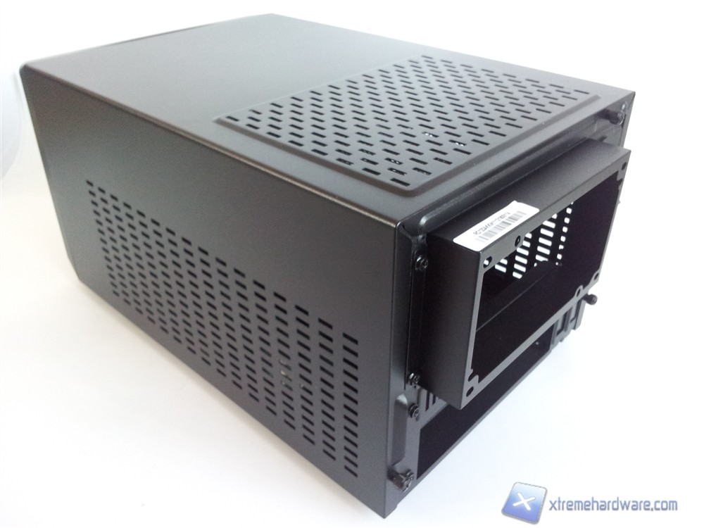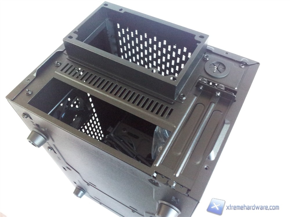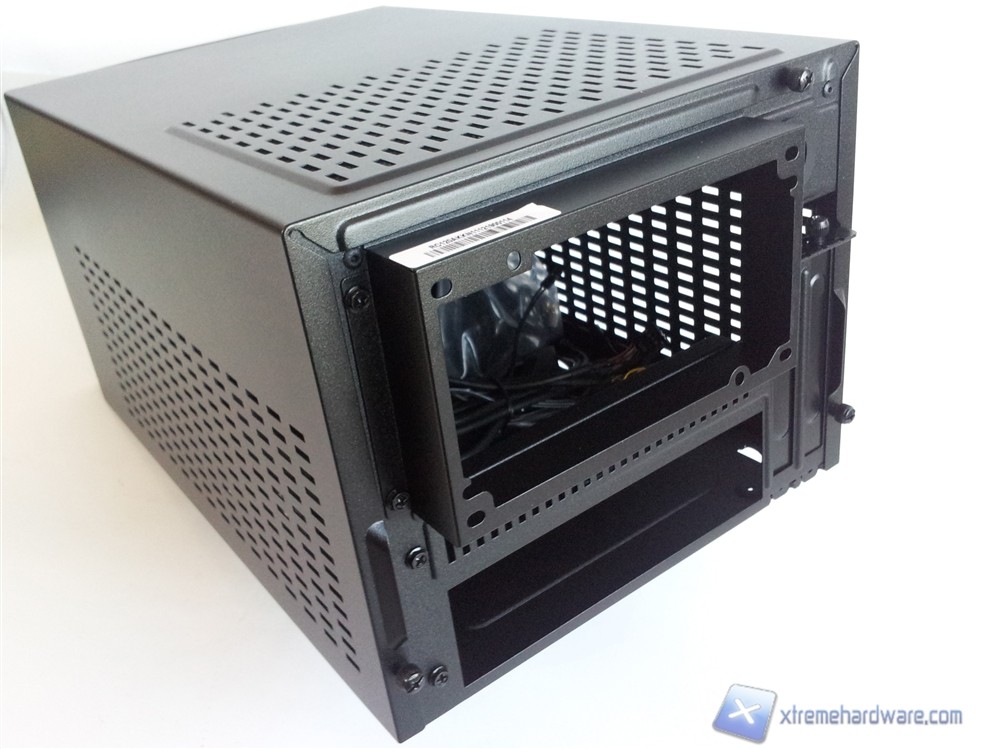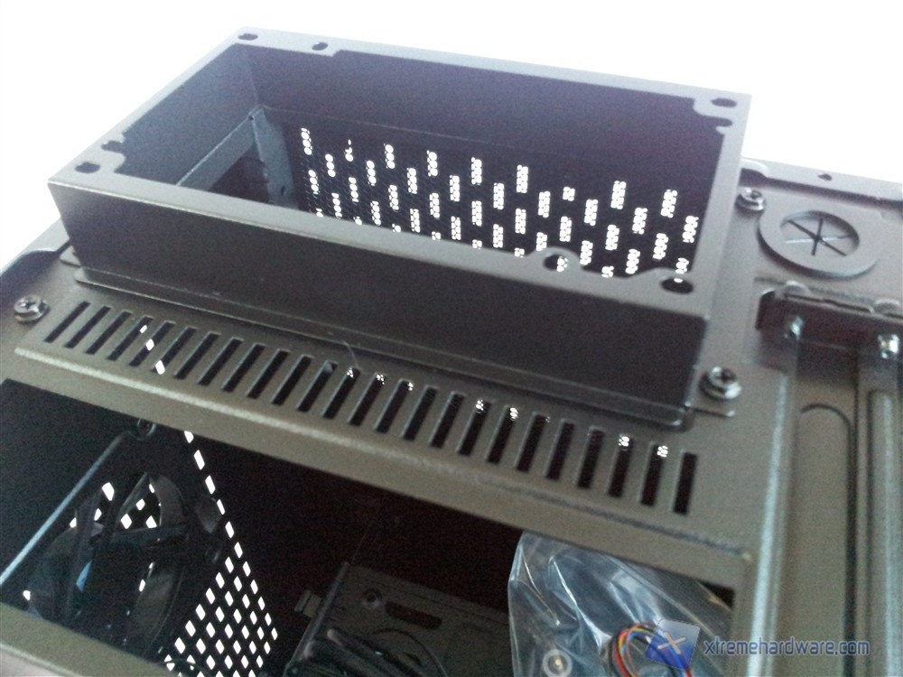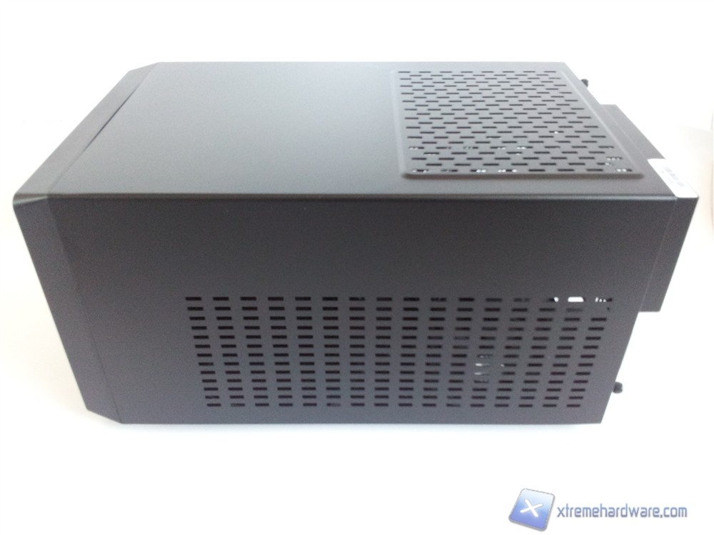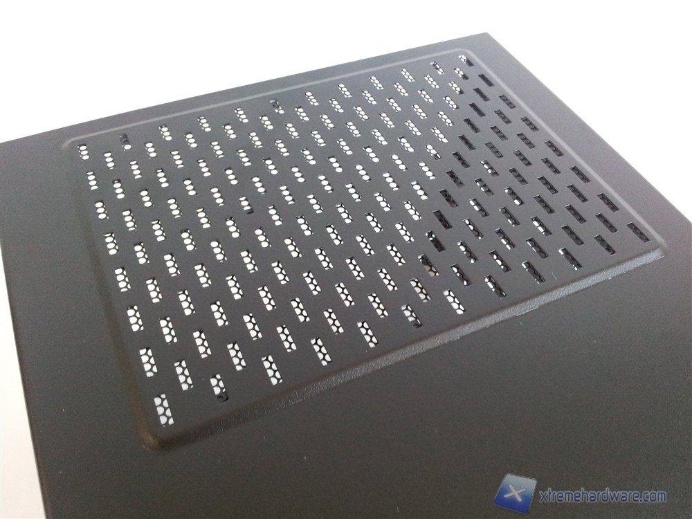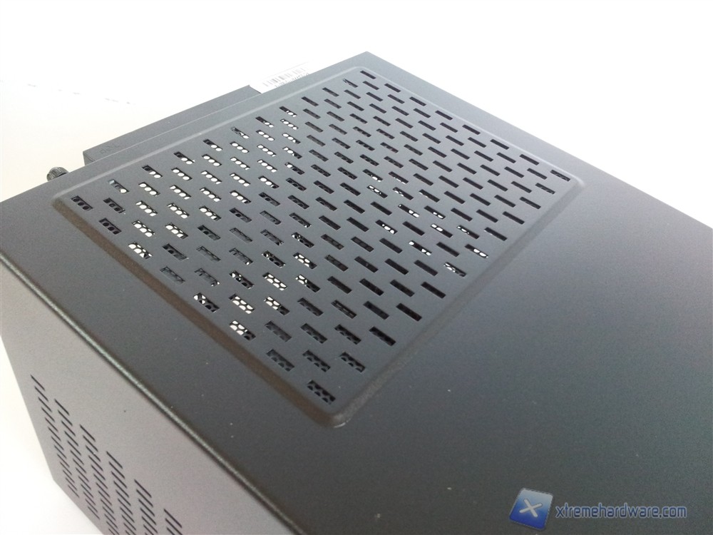 La parte superiore presenta una grande griglia per il passaggio dell'aria e un filtro per la polvere, la sua presenza permette di creare un flusso d'aria dedicato al raffreddamento dell'alimentatore, basterà infatti installarlo con la ventola nella parte superiore per permettere che l'aria fredda proveniente dalla parte alta del case venga risucchiata dalla ventola in entrata per poi essere espulsa dalla parte posteriore del case. Il filtro in questo caso è essenziale, poiché la posizione orizzontale non capovolta favorisce l’accumulo della polvere tra le componenti dell’alimentatore.
