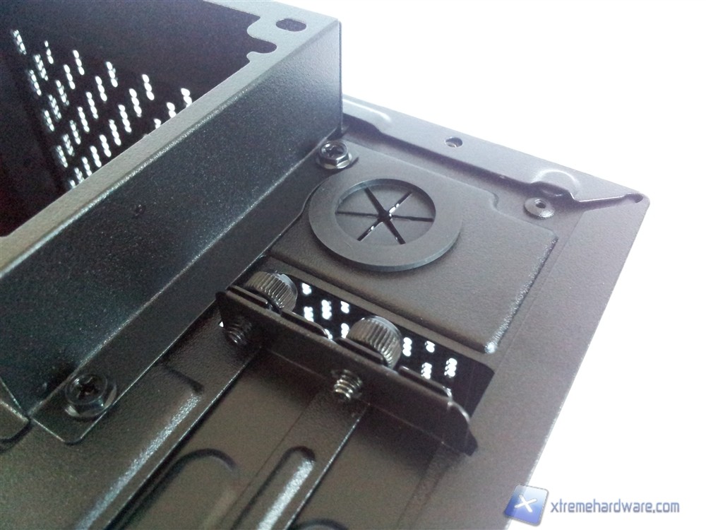 Cooler Master ha pensato anche agli amanti del raffreddamento a liquido inserendo anche un passaparete in gomma per il passaggio dei tubi. La scelta di inserirne solo uno farà sicuramente storcere il naso soprattutto agli utenti europei: oltreoceano è infatti diffusa la tecnica della Fill-port per il rabbocco del sistema a liquido, in Europa invece è preferita la tecnica del loop completo senza raccordi a "Y", inoltre la posizione del passaparete è abbastanza scomoda in quanto per poter collegare il tubo ad una vaschetta presente sul bay bisognerà districarsi nel piccolissimo spazio a disposizione,ridotto ulteriormente dall'alimentatore e dalla scheda video.