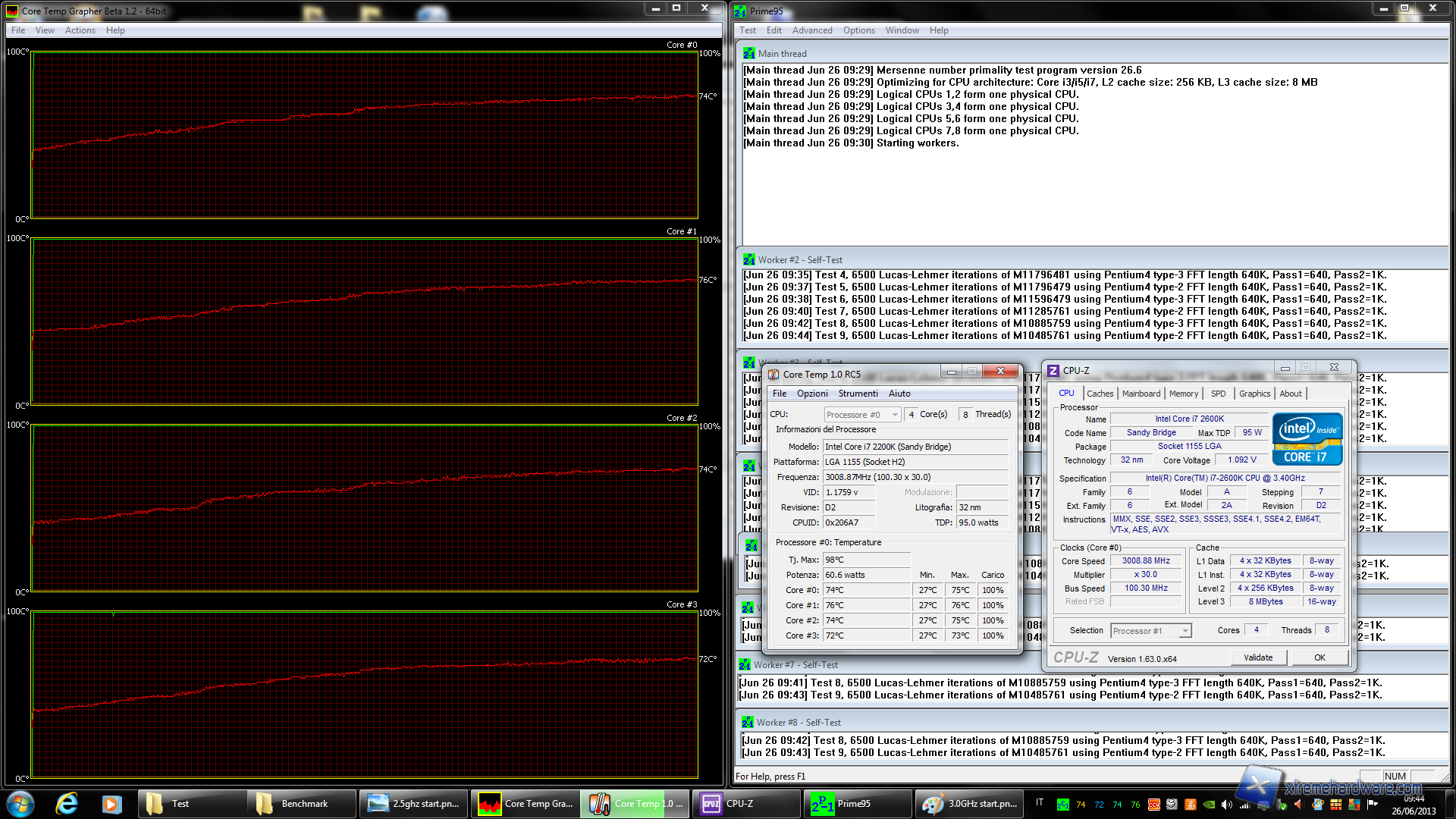 In questa prova è stata settata una frequenza di 3.008 MHz abbinata ad un Vcore di 1.092V. In questo caso dopo circa 5 minuti le temperature sono già a circa 57/60°C e tenderanno nei minuti successivi a salire ulteriormente. Nel secondo grafico, come si può vedere, abbiamo raggiunto una temperatura di 76°C su un Core, con una media sul die di 74°C dopo circa 15 min. di stress test. Probabile che nei minuti successivi la temperatura avrebbe subito un ulteriore rialzo, ma al massimo di un paio di gradi.