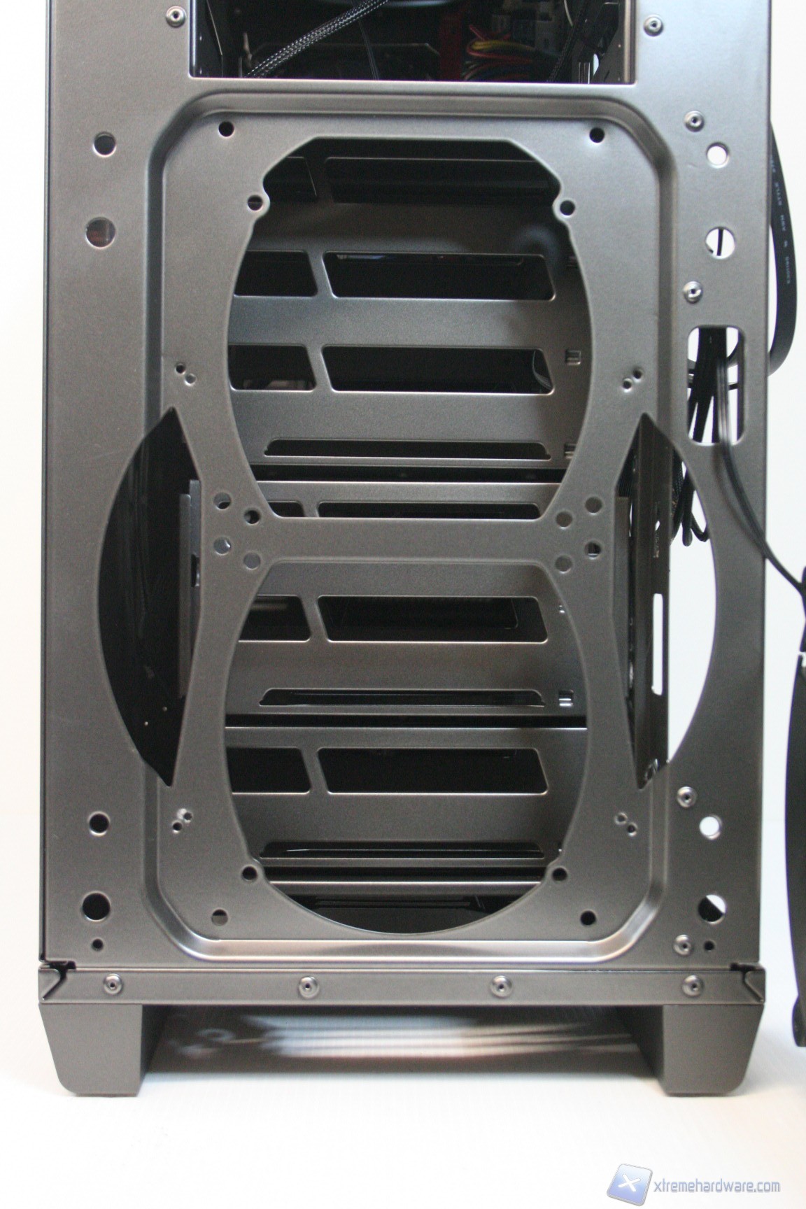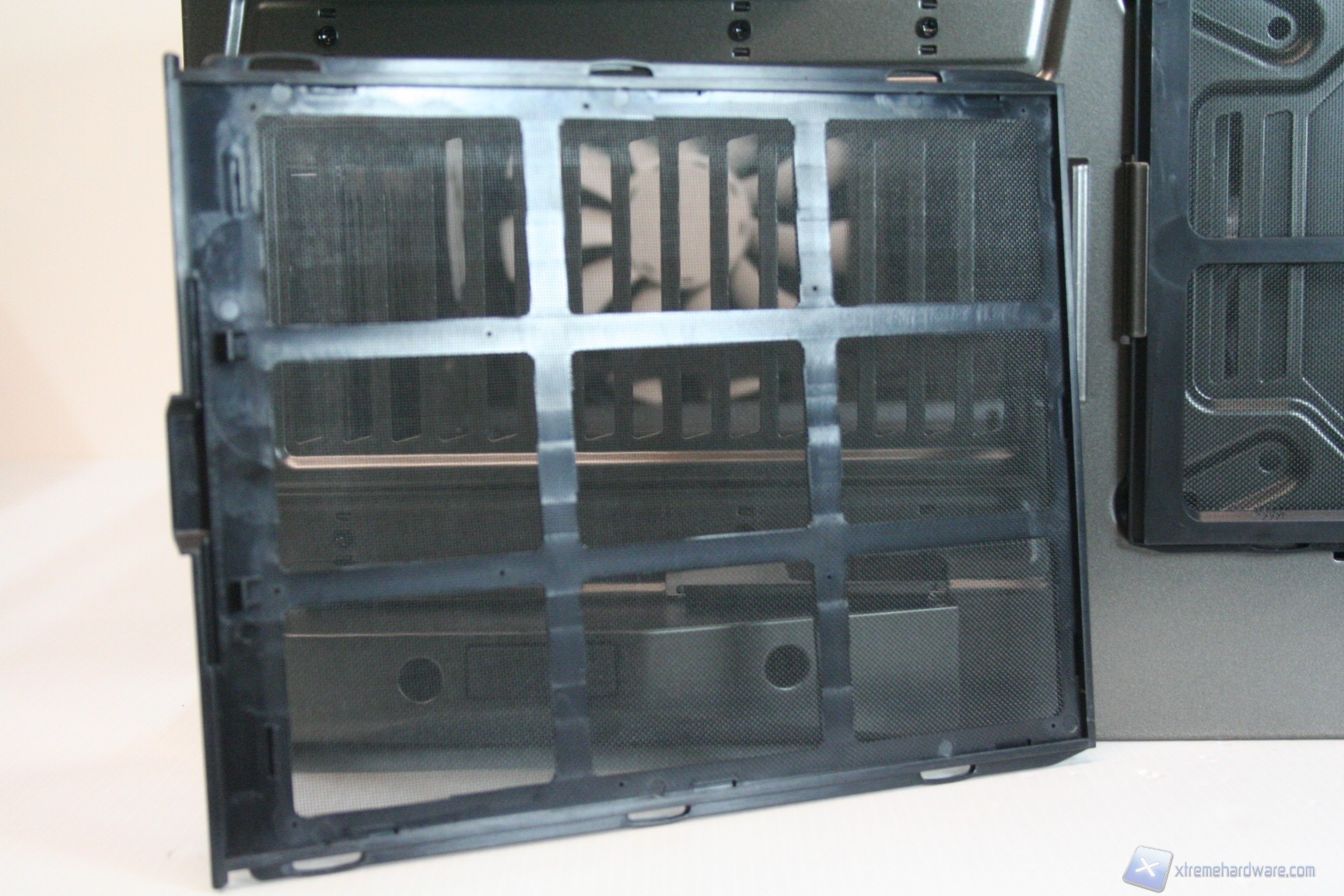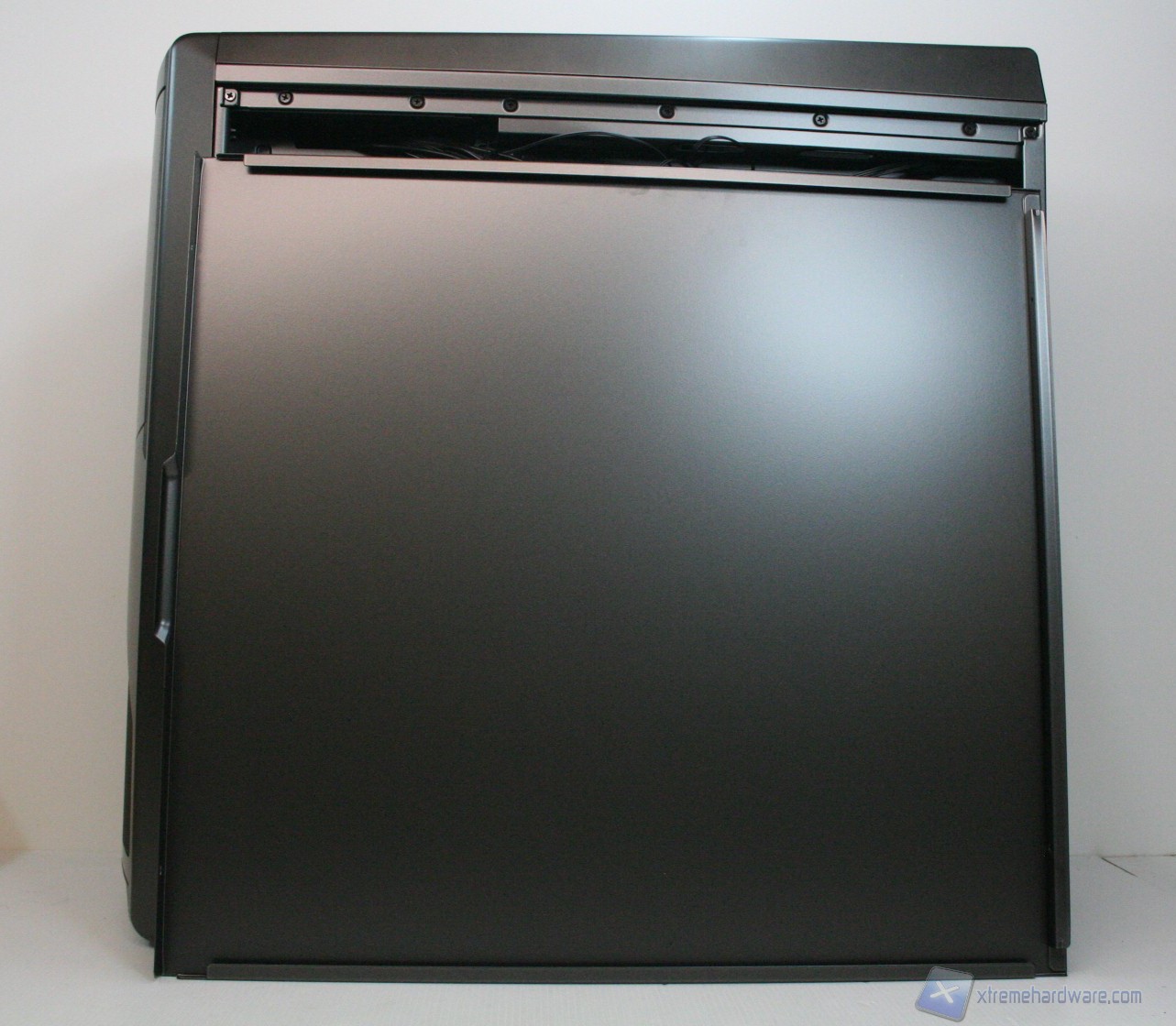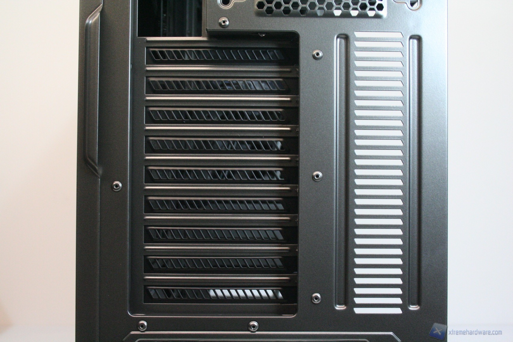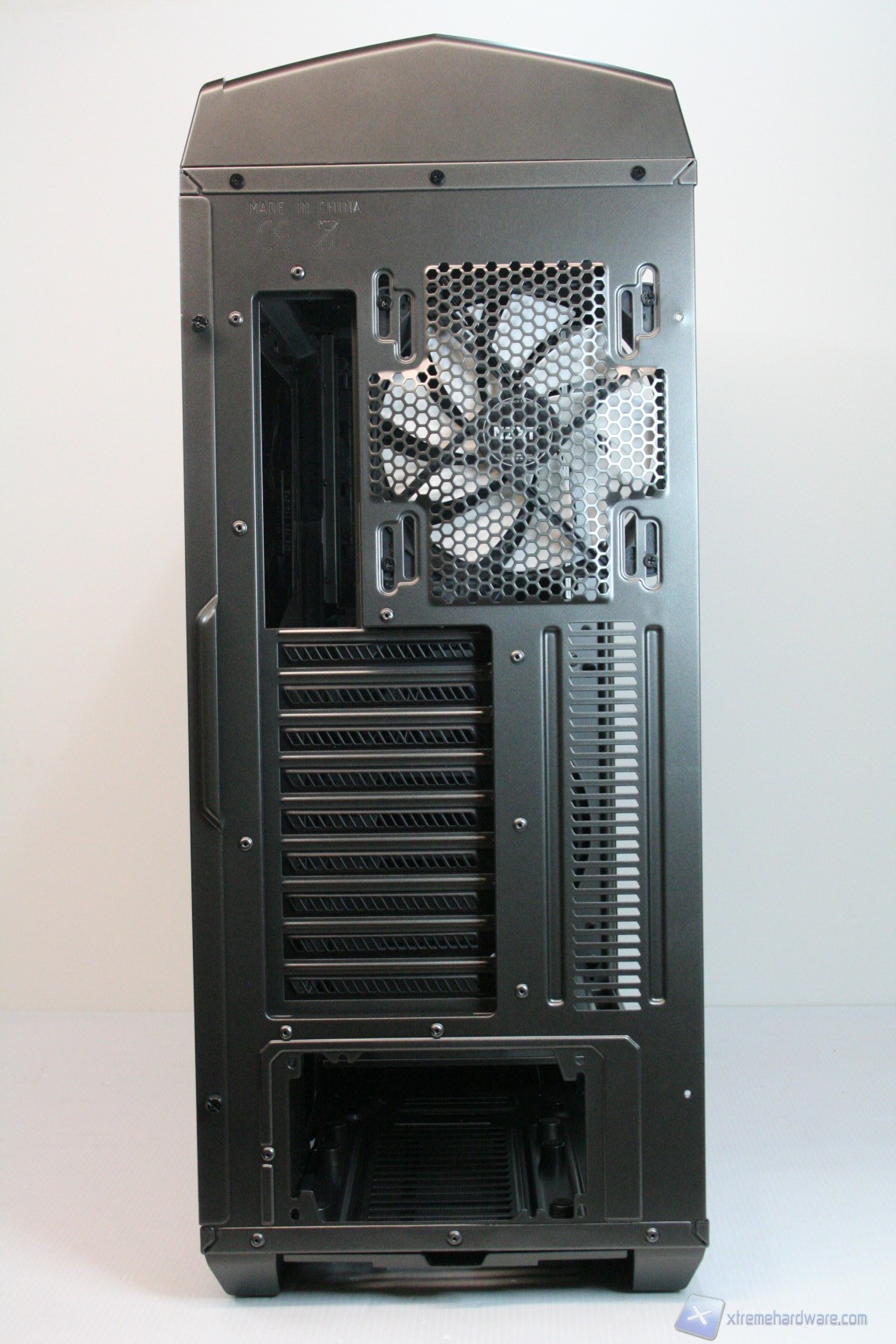 Posteriormente abbiamo una configurazione classica, ma maggiorata, con alimentatore nella parte inferiore, 9 slot di espansione PCI che presentano delle aperture d’aerazione ma nessuna fessura per l’installazione di tubazioni a liquido nella parte posteriore. Se vogliamo questa può essere una pecca, ma data l’enorme compatibilità interna non sarà necessario adattare radiatori esternamente. C’è la predisposizione per una ventola da 120/140mm (è preinstallata una 140mm) ed infine sono presenti delle aperture laterali per la ventilazione passiva del cabinet. Da notare il filtro antipolvere nella parte inferiore e la possibilità di modificare a piacimento il posizionamento verticale della ventola.