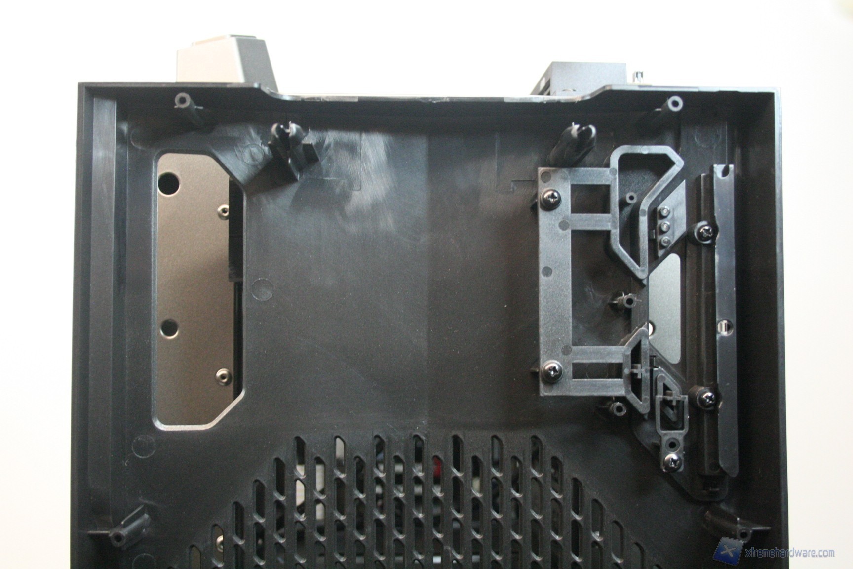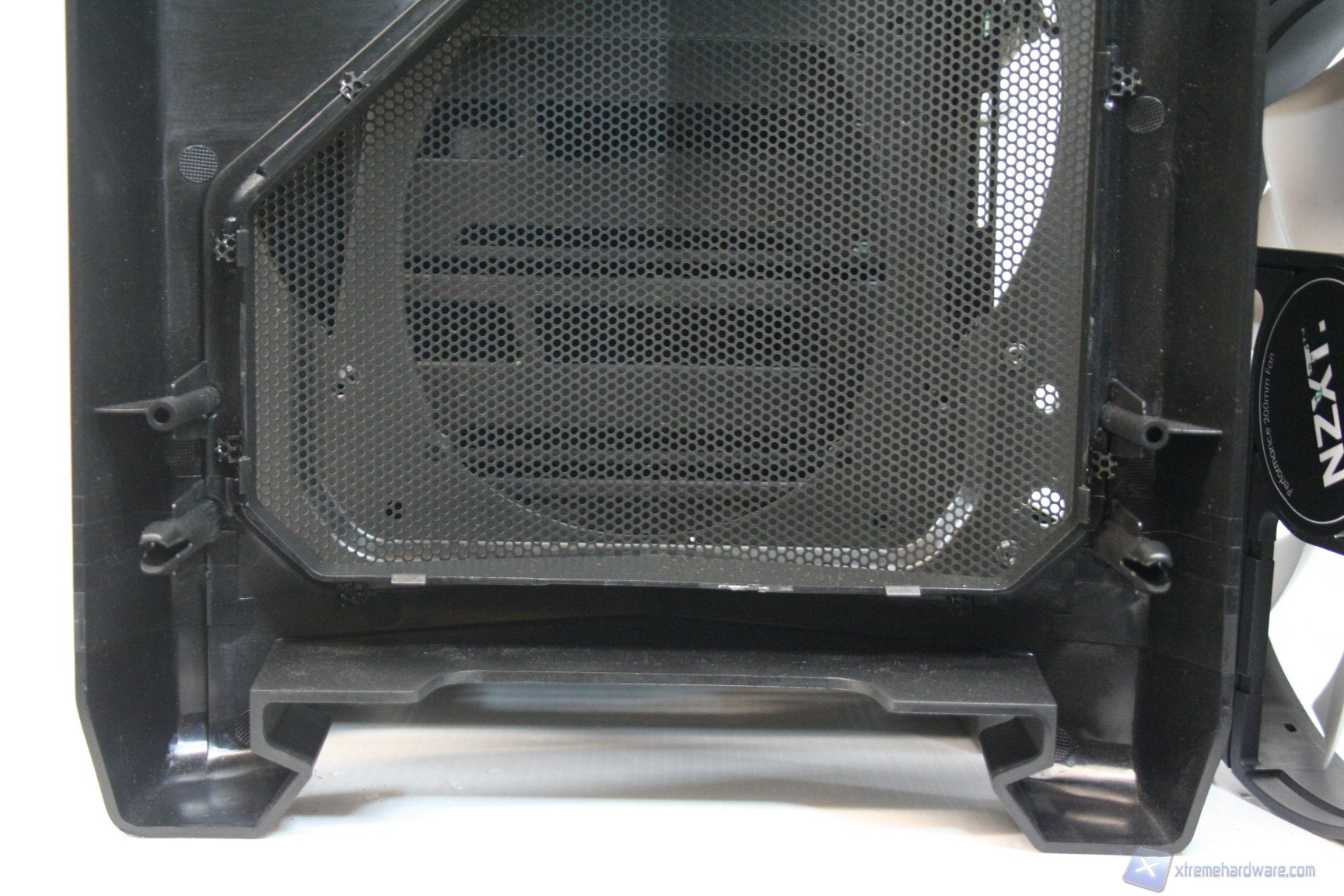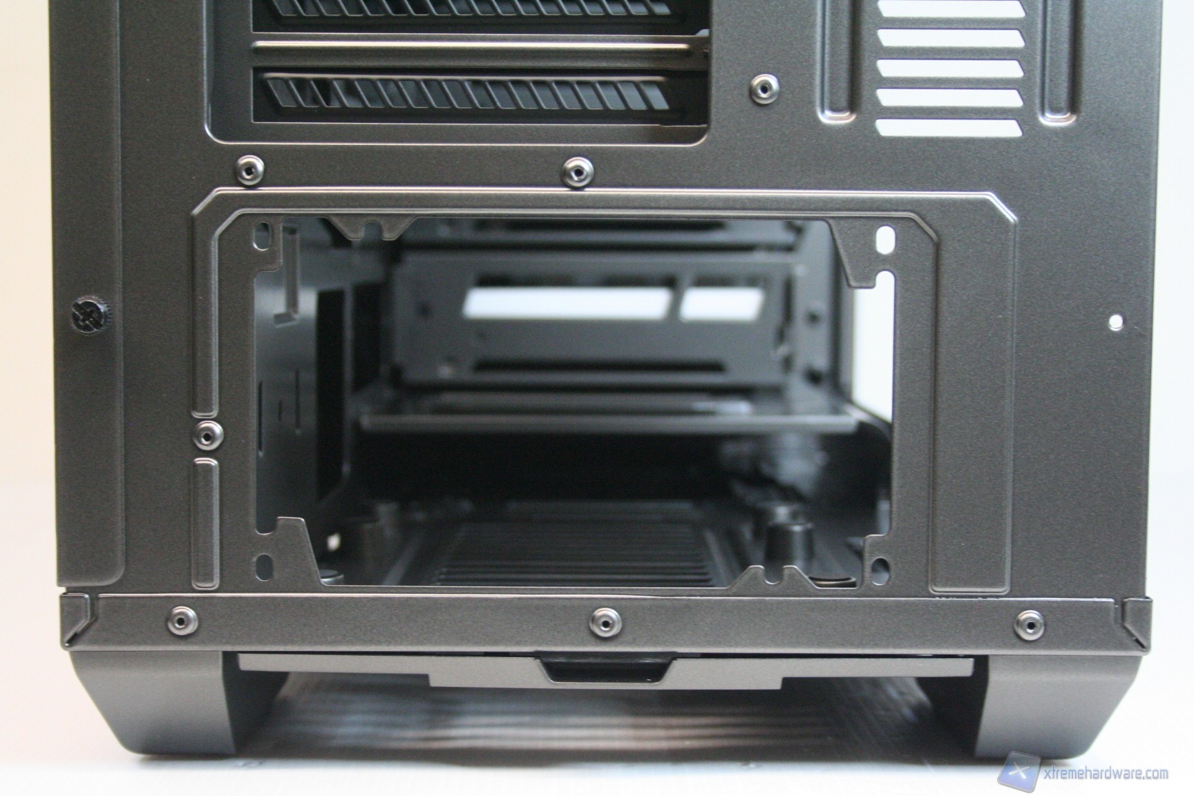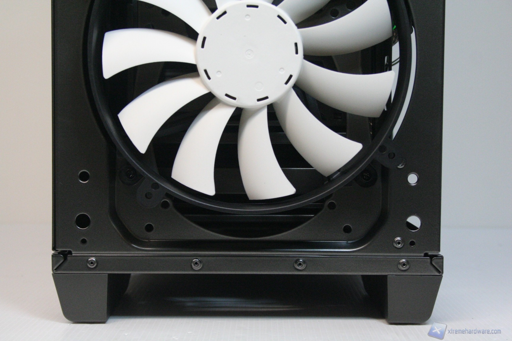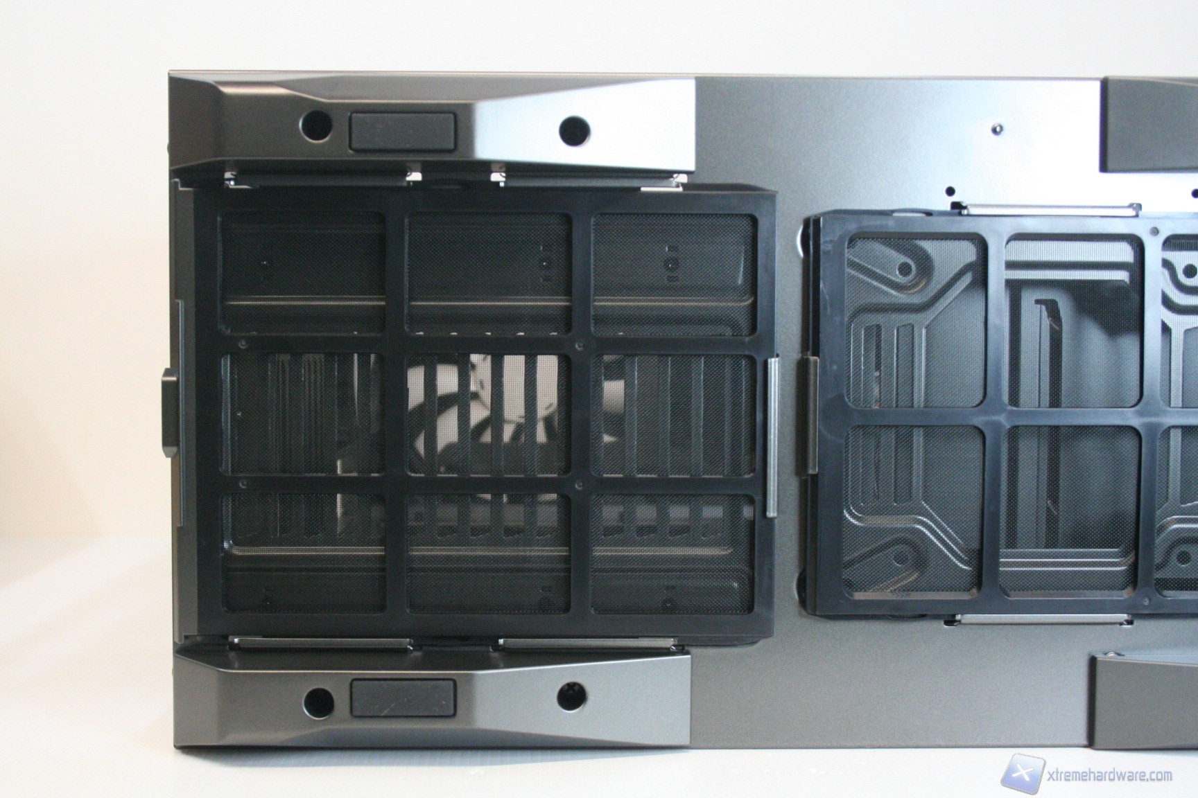 Posteriormente abbiamo una configurazione classica, ma maggiorata, con alimentatore nella parte inferiore, 9 slot di espansione PCI che presentano delle aperture d’aerazione ma nessuna fessura per l’installazione di tubazioni a liquido nella parte posteriore. Se vogliamo questa può essere una pecca, ma data l’enorme compatibilità interna non sarà necessario adattare radiatori esternamente. C’è la predisposizione per una ventola da 120/140mm (è preinstallata una 140mm) ed infine sono presenti delle aperture laterali per la ventilazione passiva del cabinet. Da notare il filtro antipolvere nella parte inferiore e la possibilità di modificare a piacimento il posizionamento verticale della ventola.