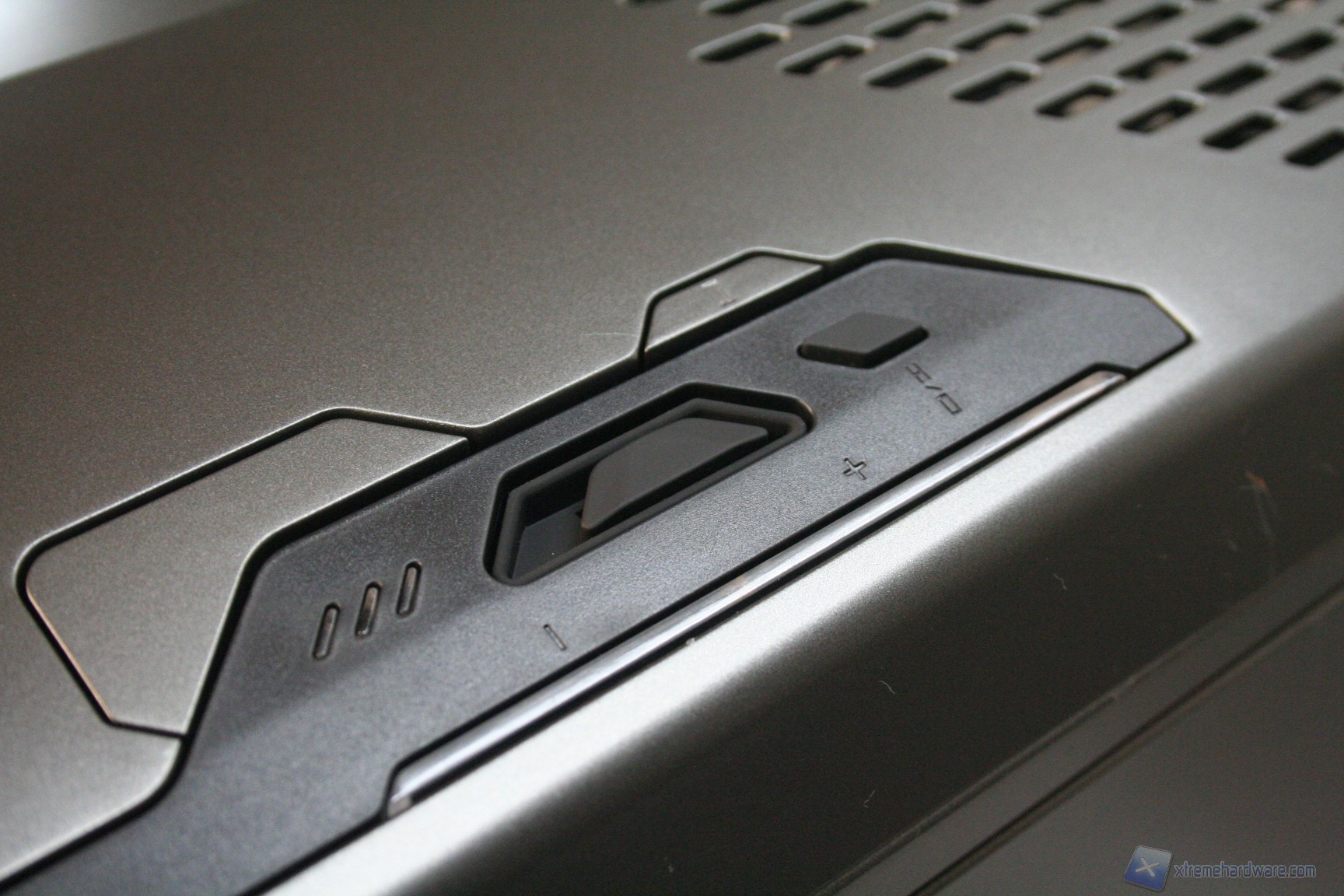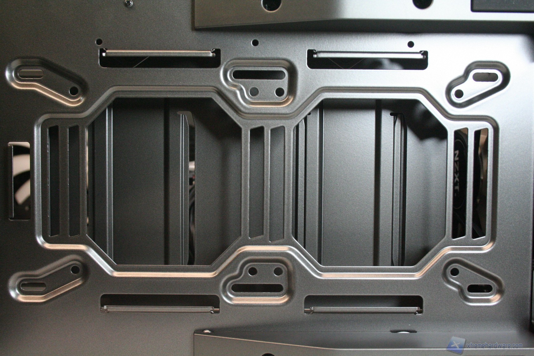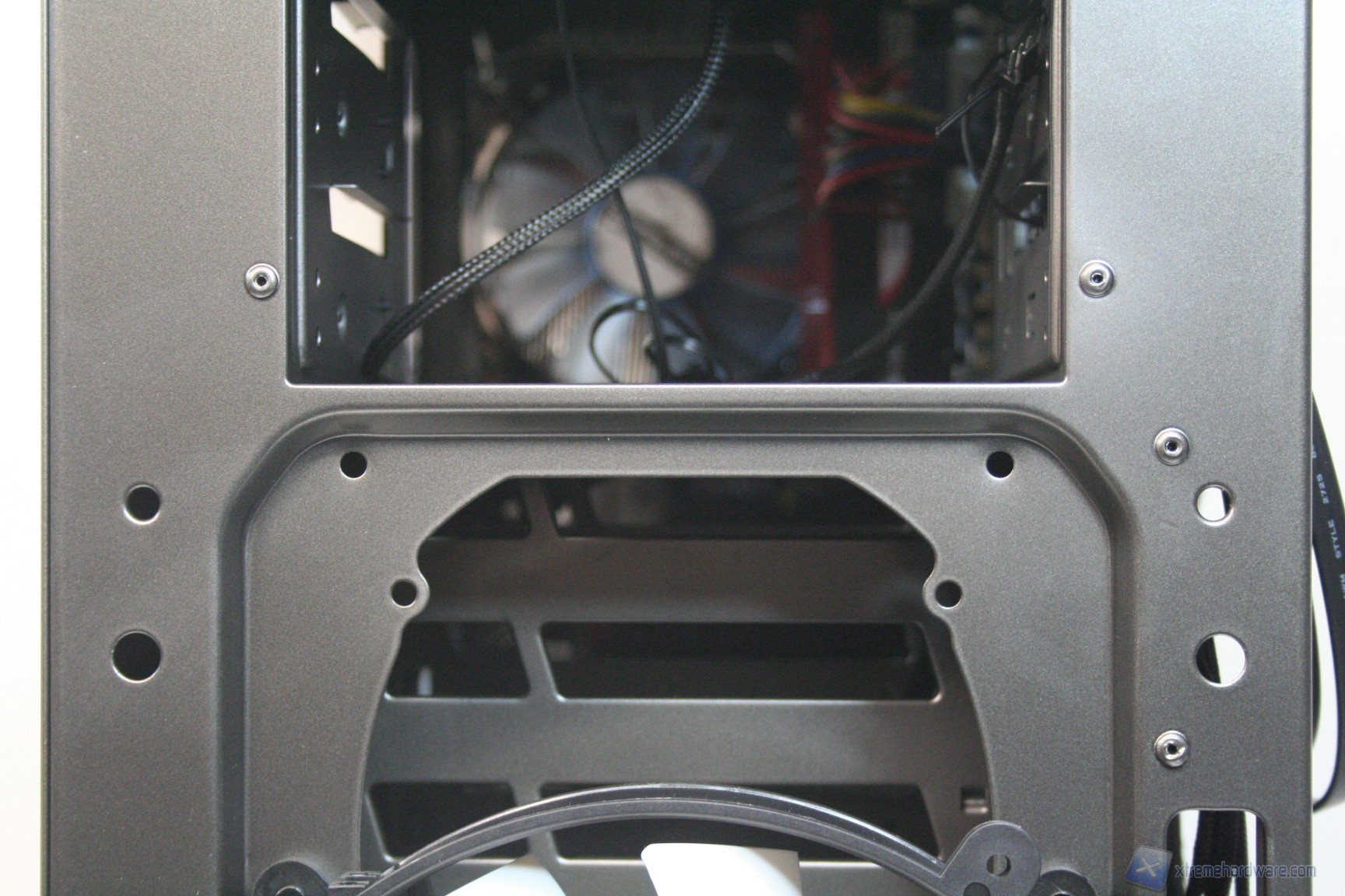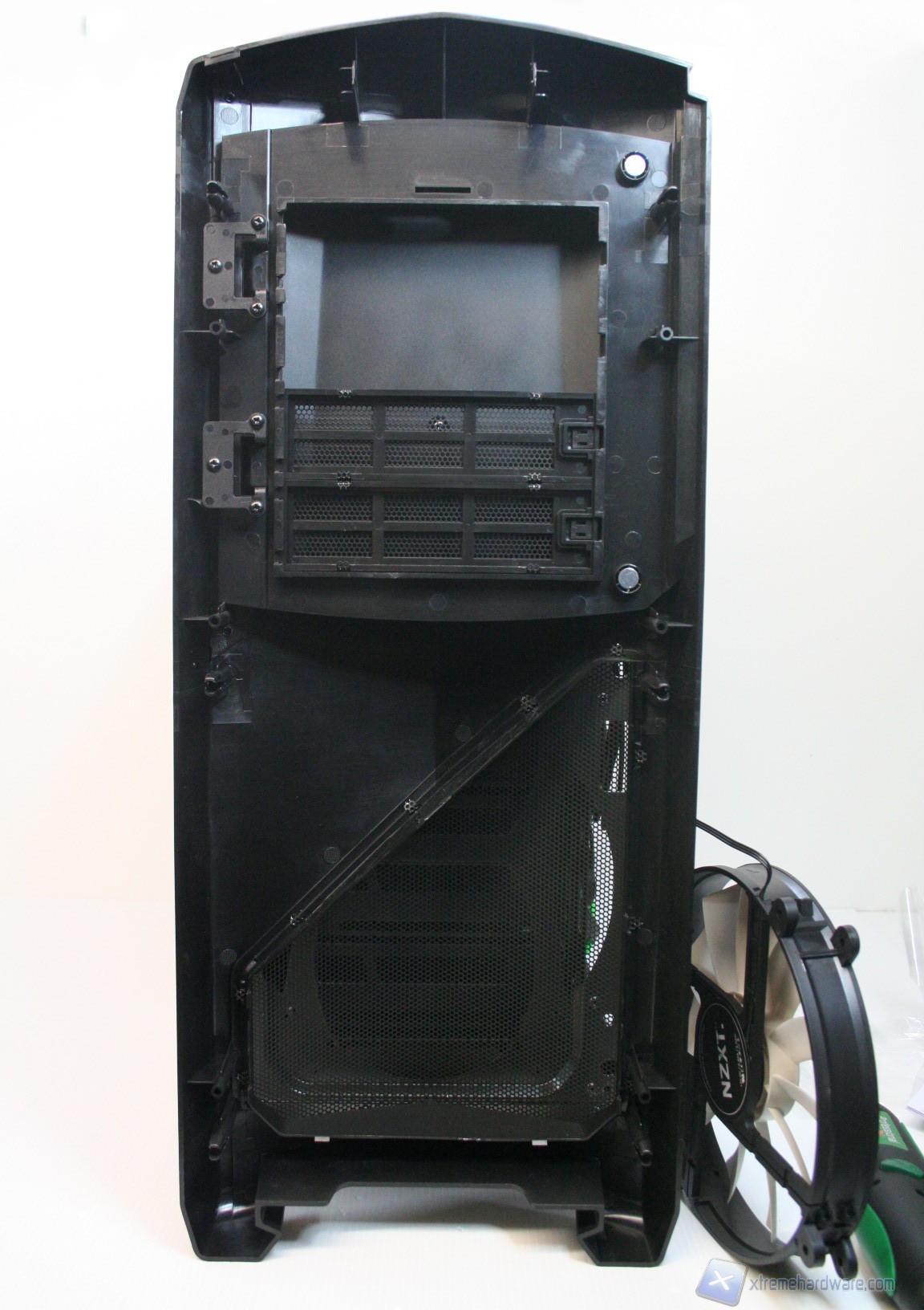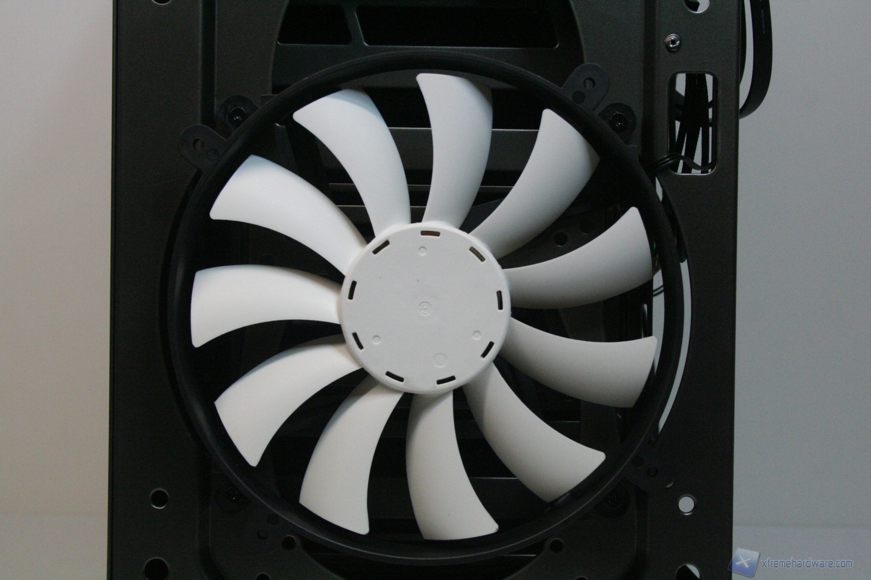 Posteriormente abbiamo una configurazione classica, ma maggiorata, con alimentatore nella parte inferiore, 9 slot di espansione PCI che presentano delle aperture d’aerazione ma nessuna fessura per l’installazione di tubazioni a liquido nella parte posteriore. Se vogliamo questa può essere una pecca, ma data l’enorme compatibilità interna non sarà necessario adattare radiatori esternamente. C’è la predisposizione per una ventola da 120/140mm (è preinstallata una 140mm) ed infine sono presenti delle aperture laterali per la ventilazione passiva del cabinet. Da notare il filtro antipolvere nella parte inferiore e la possibilità di modificare a piacimento il posizionamento verticale della ventola.