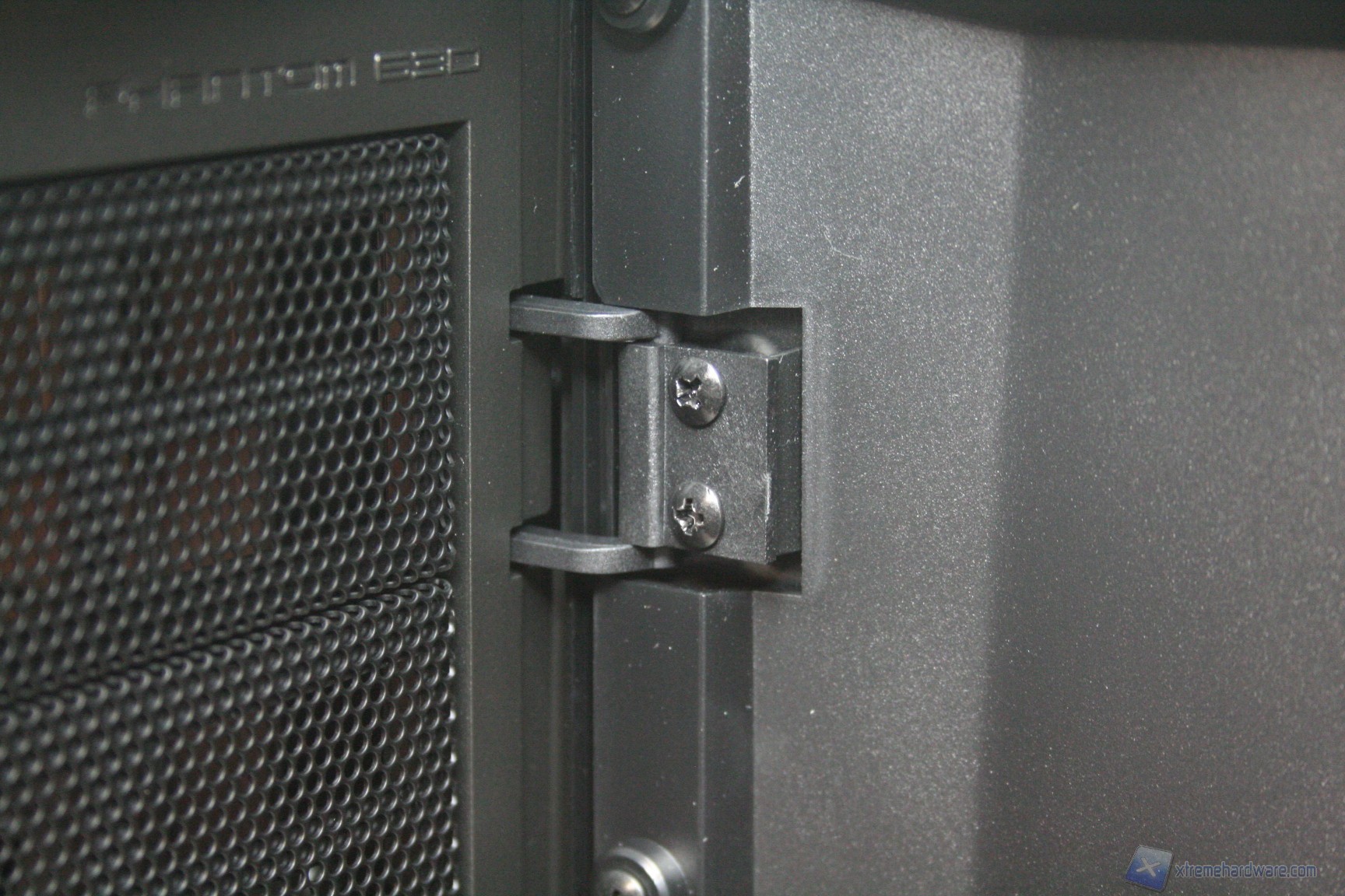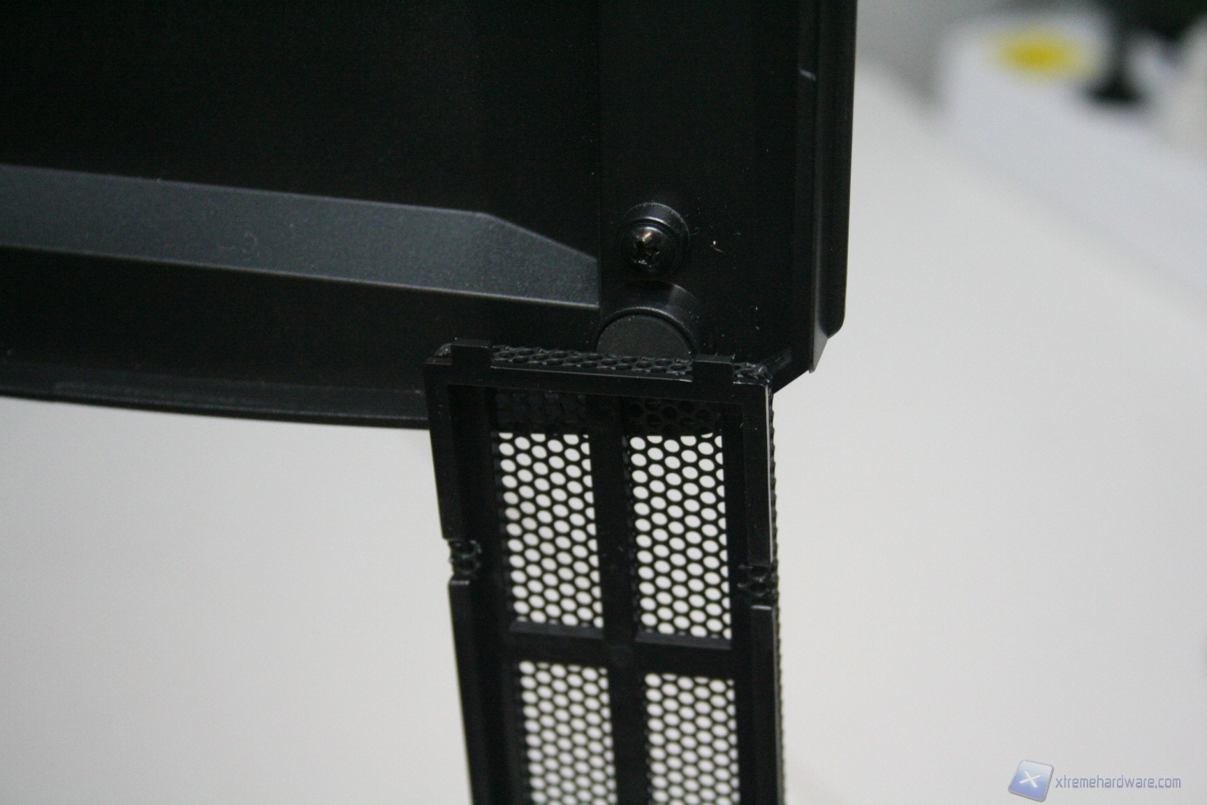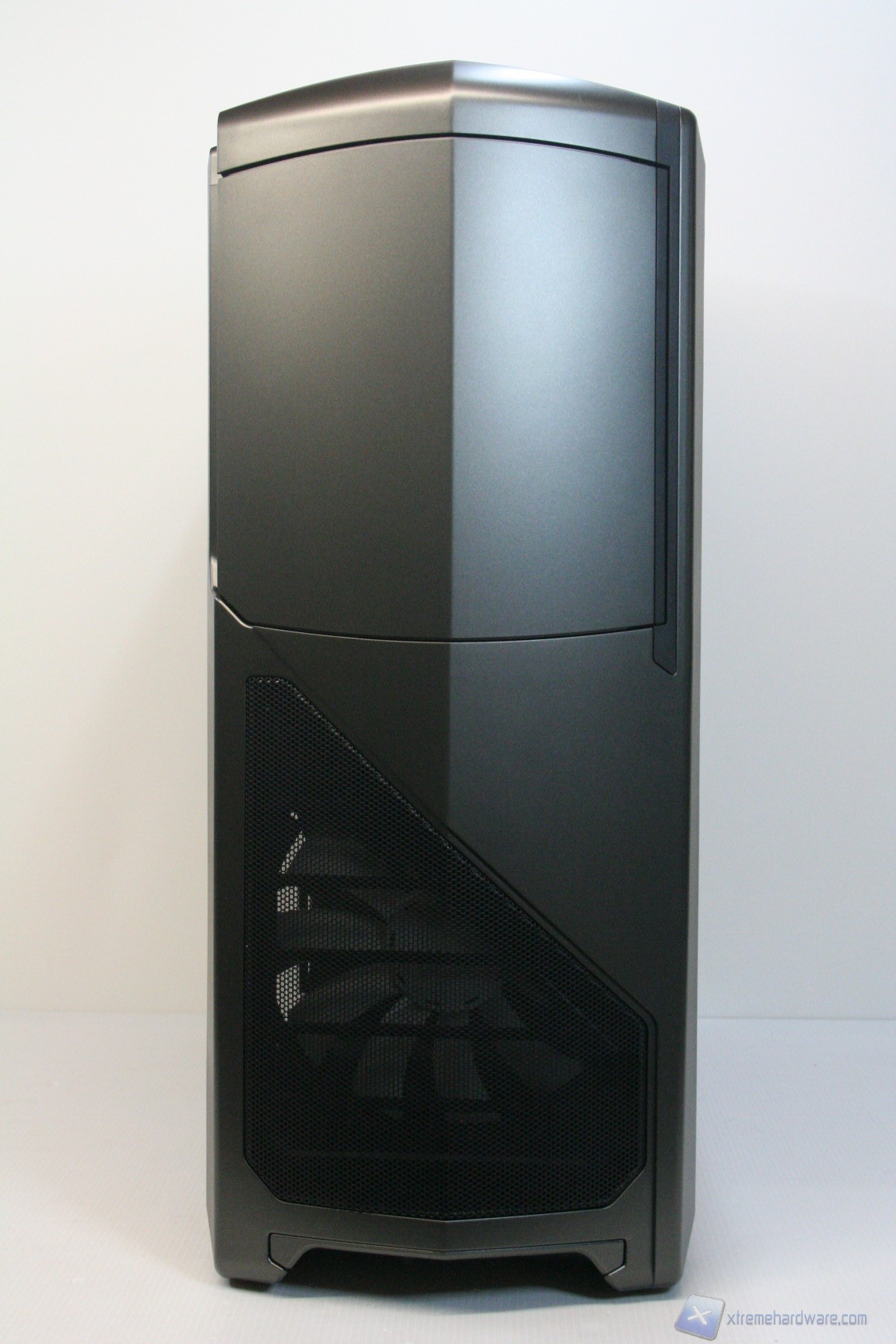 La parte frontale è caratterizzata da un profilo caratteristico della serie, con un pannello superiore apribile ed una ventola inferiore, con filtri antipolvere, da 200mm. Lo sportello superiore ci permete l’accesso ai 4 bay 5,25” e al lettore di memorie SD integrato. Nella parte inferiore del cabinet è presente il filtro dell’aria in ingresso per le due ventole opzionali da 140mm,estraibilie frontalmente, Facciamo presente però che impugnando il cabinet e spostandolo, il posizionamento di quest’ultimo è leggermente scomodo perché si tende ad estrarlo automaticamente dalla sede. Sarebbe opportuno fissarlo con un sistema di sblocco a molla. Comunque sia la praticità è elevatissima e ci si metterà pochissimo per levarlo. Non sono presenti LED quindi non risulterà essere fastidioso di notte. La compatibilità con ventole è elevatissima perché è possibile montare fino a due ventole da 140mm in sostituzione della 200mm preinstallata. Sono dotate di filtri antipolvere in ingresso, removibili però solo tramite la rimozione dello scudo anteriore. La parte frontale è caratterizzata da una struttura in plastica dura con finitura opaca e colorazione “Gunmetal”. La finitura e la realizzazione, sono molto valide.