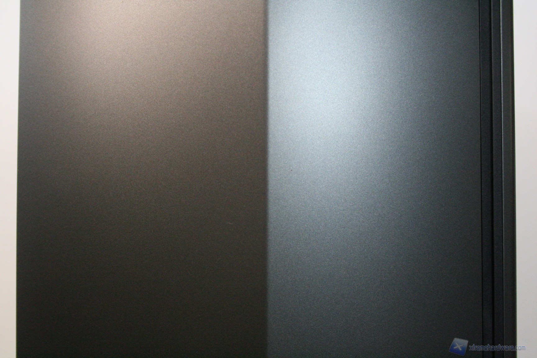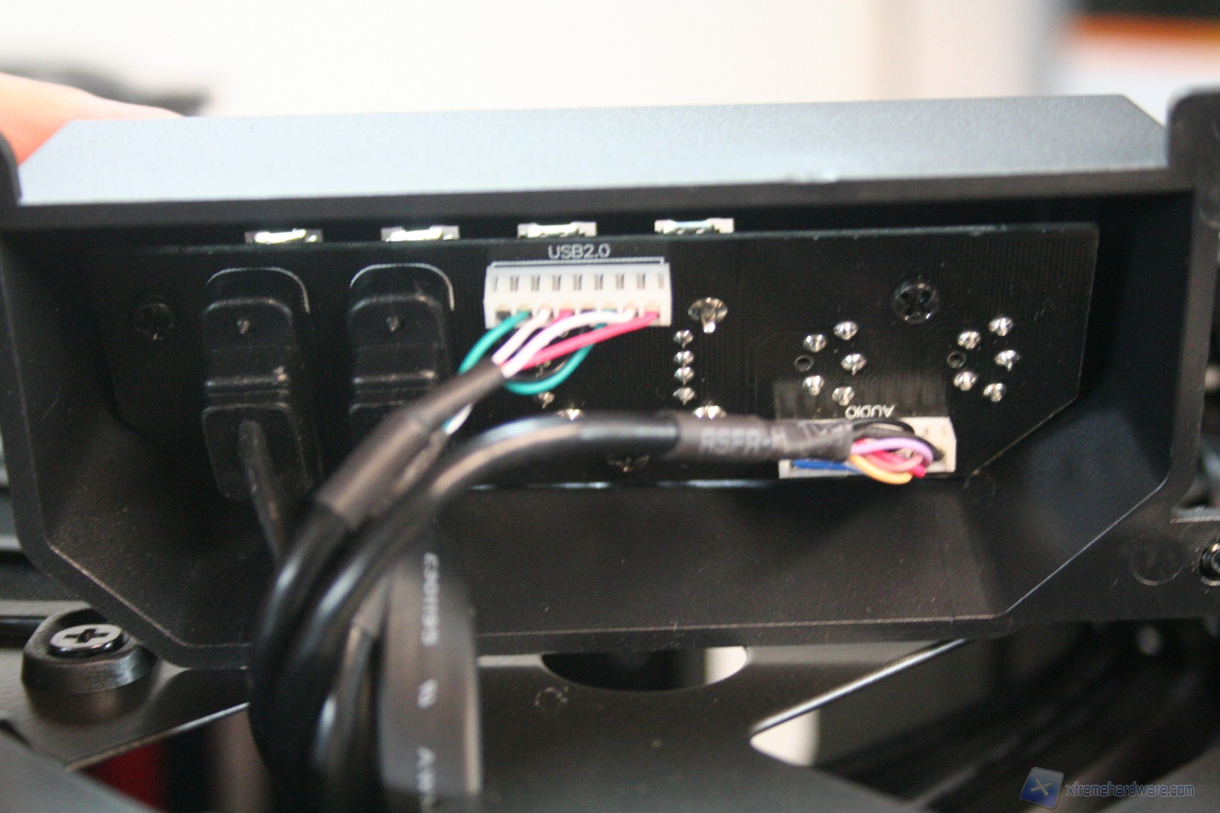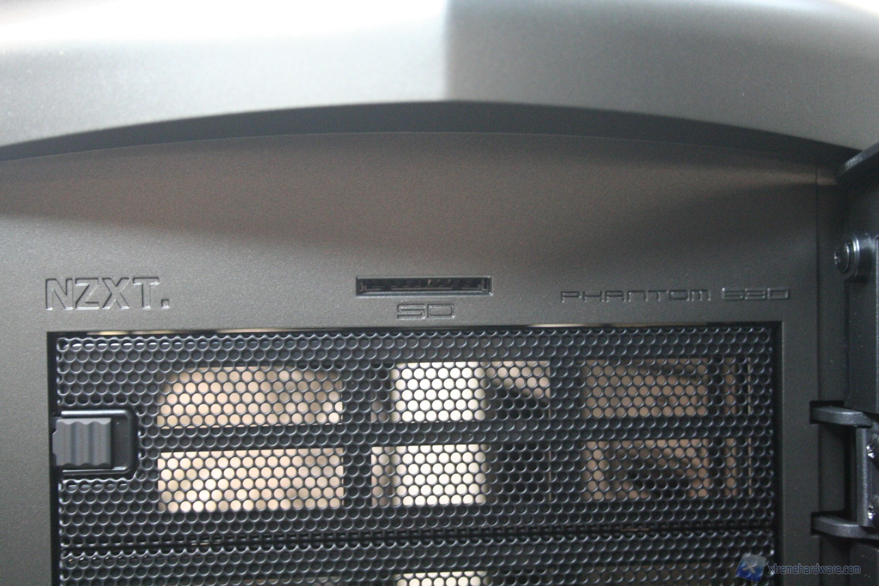 La parte frontale è caratterizzata da un profilo caratteristico della serie, con un pannello superiore apribile ed una ventola inferiore, con filtri antipolvere, da 200mm. Lo sportello superiore ci permete l’accesso ai 4 bay 5,25” e al lettore di memorie SD integrato. Nella parte inferiore del cabinet è presente il filtro dell’aria in ingresso per le due ventole opzionali da 140mm,estraibilie frontalmente, Facciamo presente però che impugnando il cabinet e spostandolo, il posizionamento di quest’ultimo è leggermente scomodo perché si tende ad estrarlo automaticamente dalla sede. Sarebbe opportuno fissarlo con un sistema di sblocco a molla. Comunque sia la praticità è elevatissima e ci si metterà pochissimo per levarlo. Non sono presenti LED quindi non risulterà essere fastidioso di notte. La compatibilità con ventole è elevatissima perché è possibile montare fino a due ventole da 140mm in sostituzione della 200mm preinstallata. Sono dotate di filtri antipolvere in ingresso, removibili però solo tramite la rimozione dello scudo anteriore. La parte frontale è caratterizzata da una struttura in plastica dura con finitura opaca e colorazione “Gunmetal”. La finitura e la realizzazione, sono molto valide.
