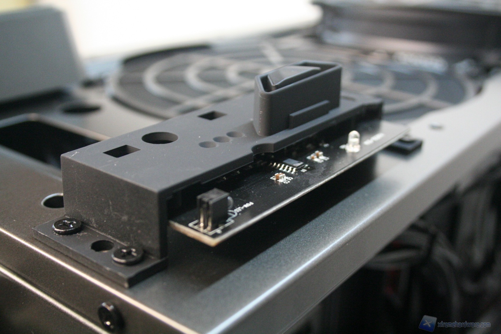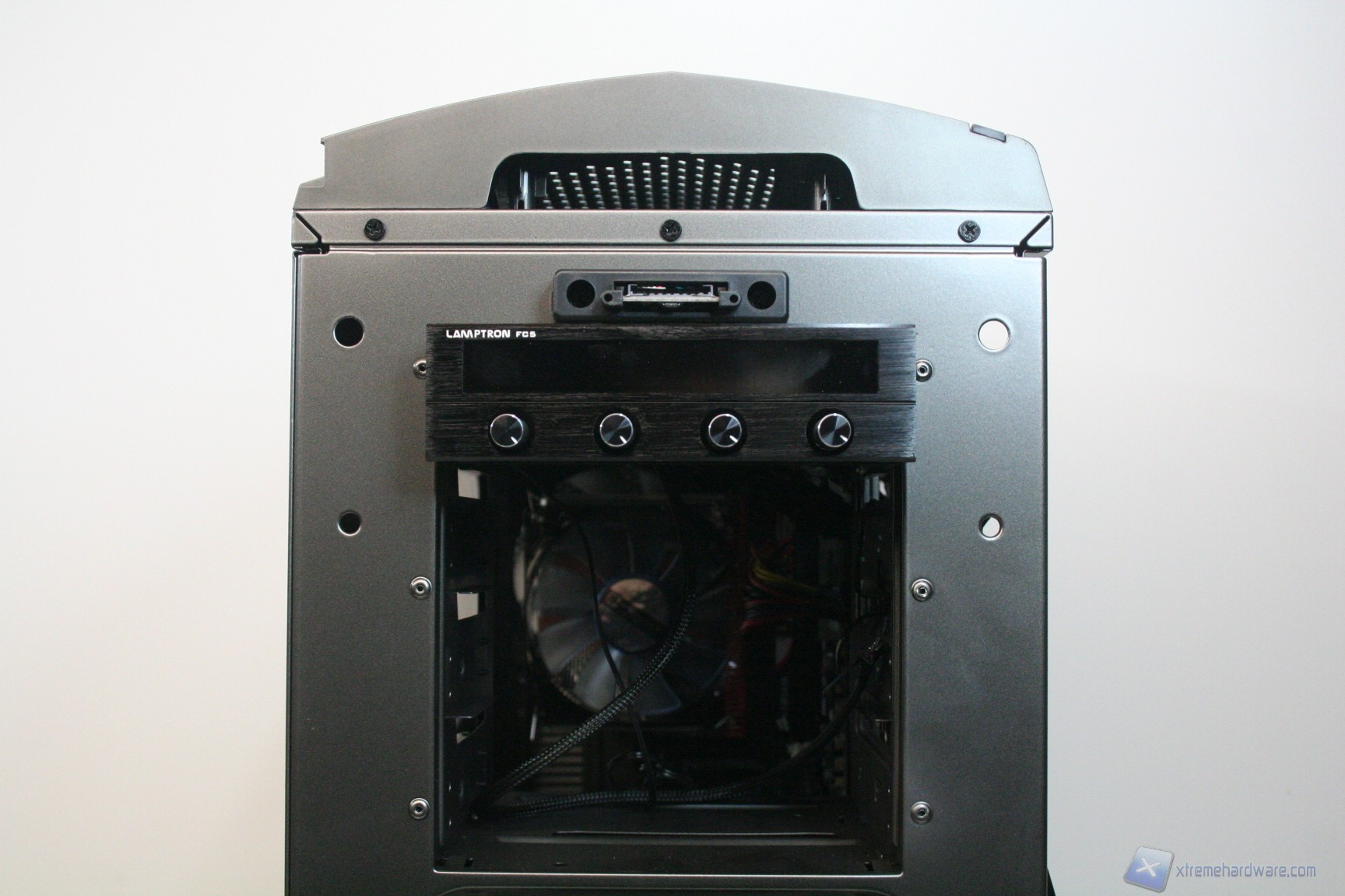 Nella parte superiore troviamo gli ingressi USB, inseriti in una struttura incassata nella paratia superiore removibile, similmente al fan controller laterale dalla parte opposta. Qui troviamo il pulsante di accensione frontale, reset, il selettore degli RPM delle ventole con tre impostazioni ed infine uno switch per spegnere i LED di installazione posteriori, feature davvero molto pratica a nostro avviso. Nella parte superiore è presente il sistema di dissipazione passiva con una grande apertura ventilata e sotto di essa è preinstallata una ventola da 200mm; facciamo presente che è possibile installarne addirittura una seconda, o molte configurazioni diverse. Il rivestimento superiore può essere rimosso partendo da quello frontale.
