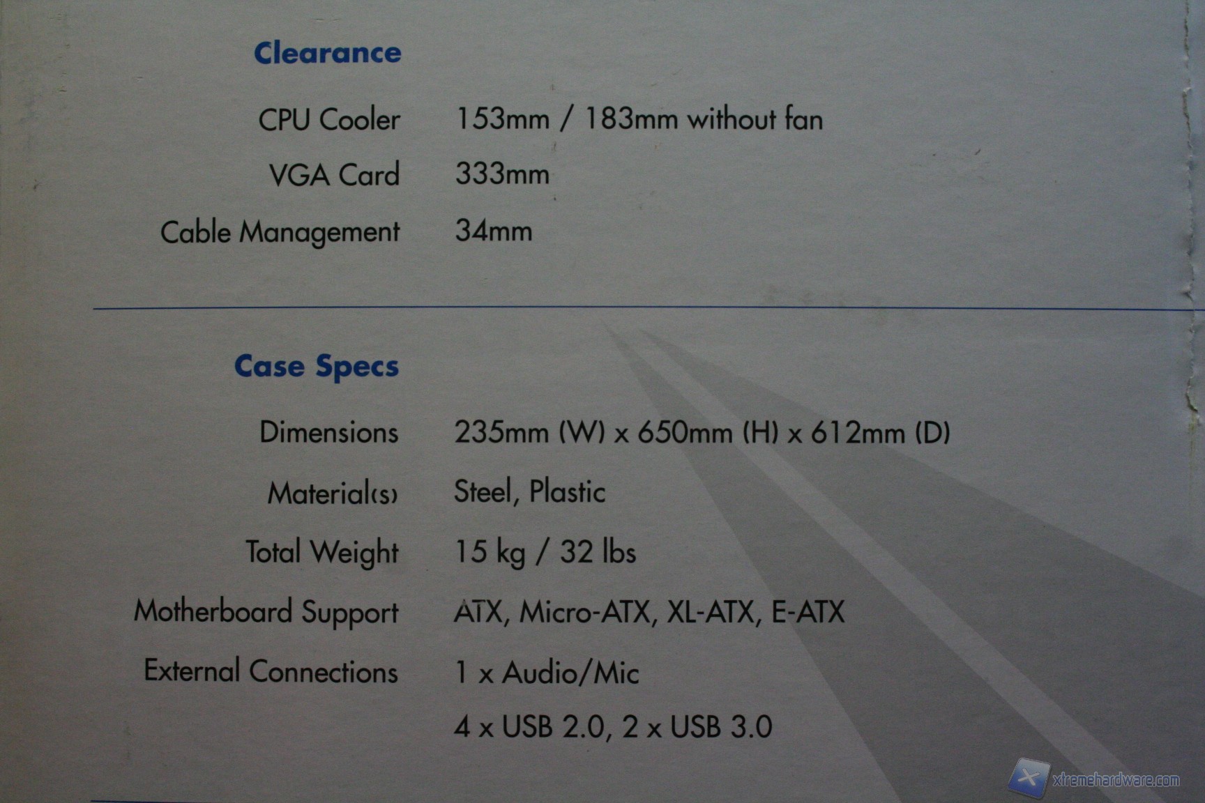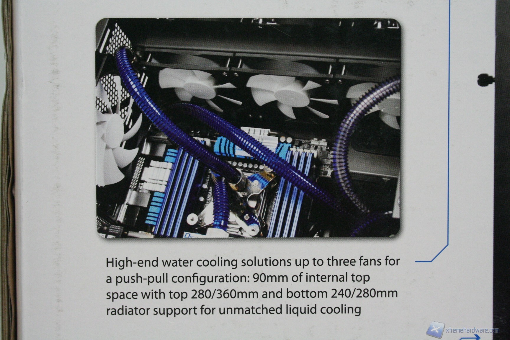La confezione esterna non si discosta dalle precedenti di questo marchio, quindi è eccellente: grande quantitativo di informazioni, dettagli e specifiche tecniche. In sostanza, degna di un cabinet di fascia enthusiast. L’imballo è ottimo, anche se presenta del poliuretano espanso solo nella parte superiore mentre ai lati è comune polistirolo; ovviamente all’interno c’è la classica bustina di plastica antigraffio, attorno allo chassis.