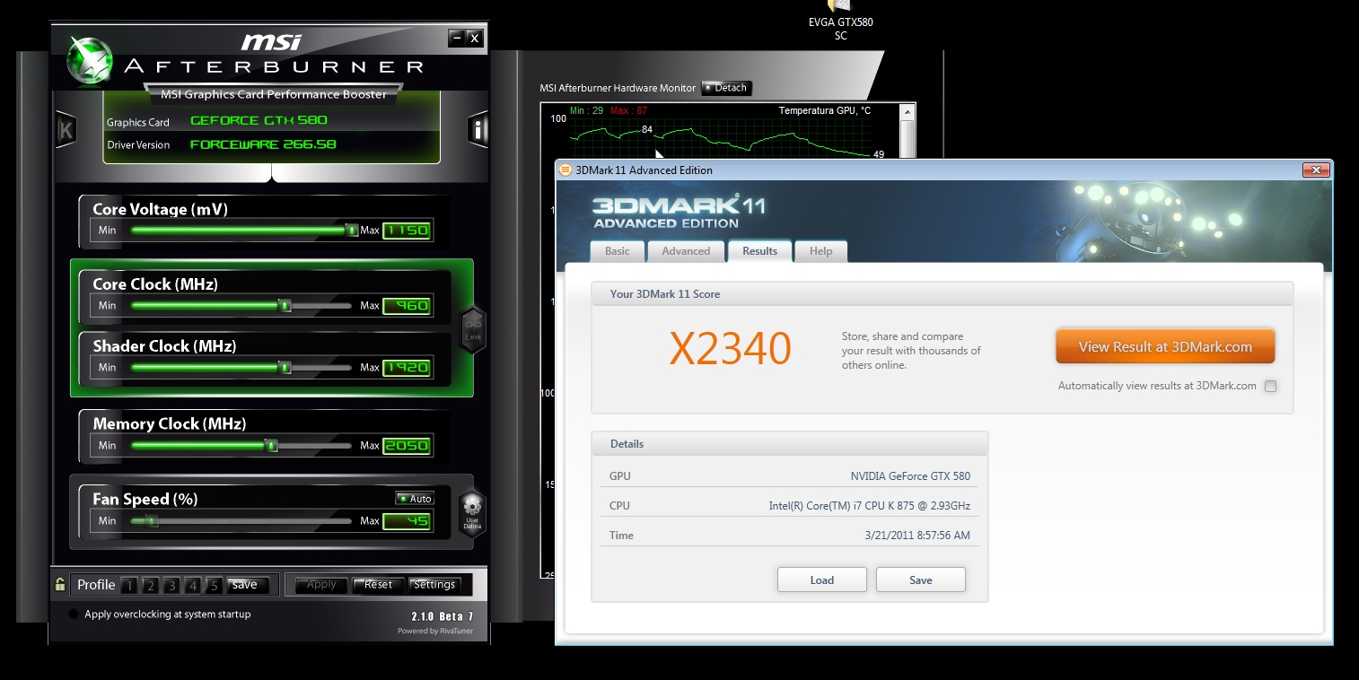 Abbiamo ovviamente effettuato i test in overclock e verificato successivamente che impatto ha avuto sulle prestazioni finali. Con il nuovo controllo introdotto da Nvidia sul consumo, ossia i 3 sensori Hardware Monitoring Manage Power, che monitorizzano in maniera istantanea la corrente assorbita, non è più possibile usare il software di stabilità FurMark o il tool di OCCT. Pertanto abbiamo dovuto percorrere una strada alternativa, abbiamo messo in loop il benchmark 3D Mark 2011 per almeno mezz'ora al fine di verificare la piena stabilità del nostro sistema. Abbiamo deciso di usare anche un software di terze parti, che ci ha anche permesso di variare il voltage core della gpu. MSI AfterBurner infatti permette di variare molte opzioni, noi abbiamo impostato un voltaggio al core grafico pari a 1.150 V che a differenza degli 1.0750 V originali, ci ha permesso di guadagnare parecchi MHz sulla frequenza finale.